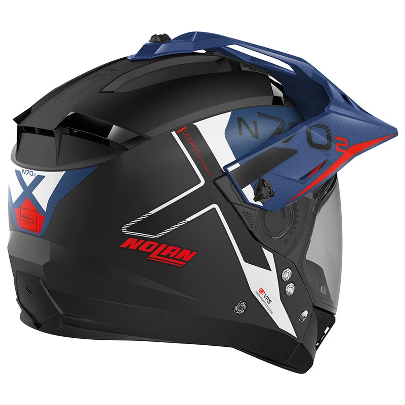 E’ il nuovo crossover da strada e fuori strada top di gamma di Nolan, il primo casco on-off dotato di mentoniera protettiva amovibile sul mercato. Si caratterizza per il design d’ispirazione off-road, le ricche dotazioni tecniche e la buona disponibilità di colori e grafiche. Volume contenuto (grazie alla disponibilità di due misure di calotta esterna), doppia omologazione P/J, visiera ultrawide, oblò particolarmente ampio compatibile con l’uso della maschera (anche a visiera montata e aperta), schermo parasole VPS (regolabile in svariate posizioni e dotato di sistema di richiamo automatico), sistema di ventilazione superiore AirBooster Technology, sistema di ritenzione con regolazione micrometrica a doppia leva Microlock2, innovativa imbottitura interna di conforto Clima Comfort (con tessuti micro-forati e paranuca regolabile) e predisposizione per il sistema di comunicazione N-Com vogliono fare di N70-2 X il crossover da strada e fuori strada di riferimento per il moto-turista più esigente