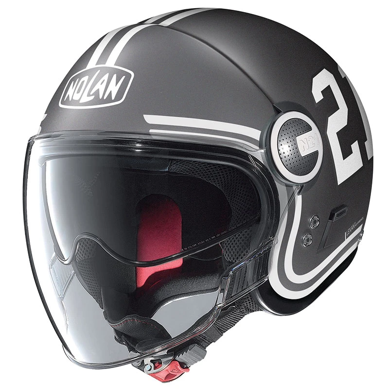 N21 si arricchisce dell’ampia visiera sagomata e particolarmente coprente, divenendo così N21 VISOR, un prodotto adatto all’uso sia cittadino che extra-urbano. Lo schermo parasole VPS (Vision Protection System) scompare all’interno della calotta, conferendo a quest’ultima una particolarità estetica e contenendone le dimensioni. La forma filante della calotta s’ispira al vintage, la tendenza del momento per tutte le età, pur presentando linee pulite e moderne. Svariati accostamenti cromatici tra imbottitura interna, bordo calotta, bordo VPS e profili del nottoli laterali consentono di ottenere molteplici declinazioni estetiche, di gusto classico e vintage. Tessuti di eccellente qualità per gli interni, disponibili in tre varianti. Curata nei minimi dettagli, l’imbottitura interna è concepita in modo da offrire la leggerezza tipica di un casco jet e, al tempo stesso, l’avvolgenza propria di un casco integrale. Completano il prodotto il sistema di ritenzione Microlock e l’anello per assicurare il casco alla motocicletta (Helmet Lock Ring).